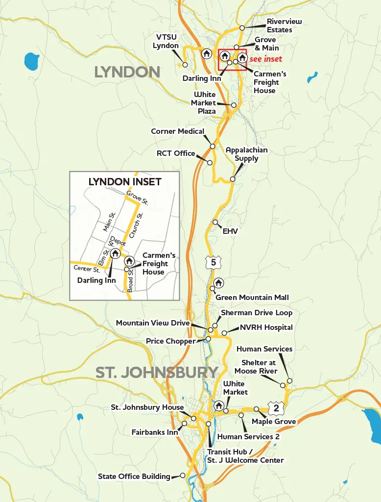 The Jay Lyn is a deviated fixed route round trip service for the general public between St. Johnsbury and Lyndon, beginning in Lyndon at 5:10 AM and ending in Lyndon at 6:00 PM. If you live within 3/4 mile of the shuttle route and would like to ride the shuttle, please call (802) 748-8170 between the hours of 7:30 AM and 4:30 PM Monday through Friday.