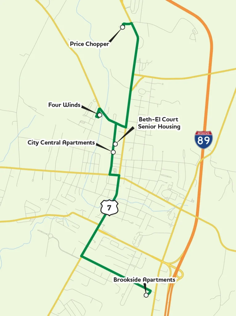 A deviated fixed route that provides shuttle service to the St. Albans Price Chopper for easy and affordable grocery shopping. The shuttle operates within the Saint Albans area on Tuesday mornings and is open to the public. Deviations from this route are available up to ¾ mile upon request. Please call 855-811-6360 at least 24 hours in advance to request a deviation.